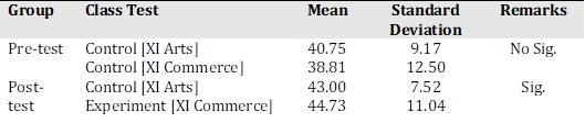 The mean score of the pre-test (class test 1) of the XI Arts and XI Commerce (both controlled groups) were 40.75 and 38.81. The mean score of the post-test (class test 2) of the XI Arts (controlled group) and XI Commerce (experiment group) were 43.00 and 44.73. Table 1 shows a slight increase in the test score of the experiment group (XI Commerce). There is a statistically significant rise in test scores in the post-test in comparison to the pre-test. The experimental group benefitted more than the control group due to the intervention program. The result is further supported by analysis of the 5 points Likert survey questionnaire as shown in Table 2.