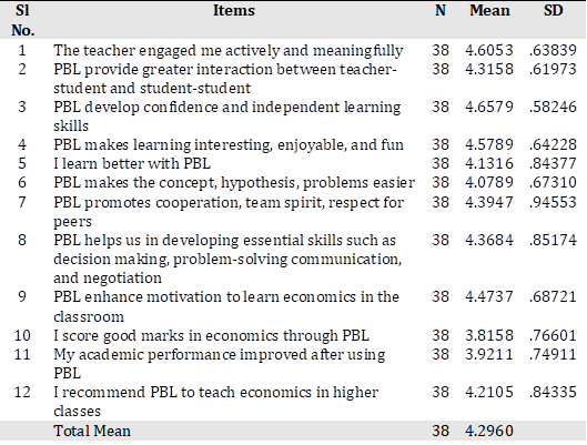The total mean score of the survey questionnaire was 4.2960, as shown in Table 2. Thus, the experimental group showed a favorable opinion toward PBL teaching-learning and, therefore, validates its remarkable impact on learning. Furthermore, the results and discussion agree with the literature review of NCERT (n.d); Carey and Whittaker (2002); Sharp and Primorse (2003); Morrison (2004).